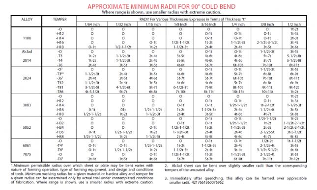 Another factor to consider is that during the process of bending, the metal hardens and strengthens by reason of the working effect. Apart from alloy selection, thickness and bend radius are also critical factors that must be considered. The table below shows the permitted bend radii for 90o bending.
